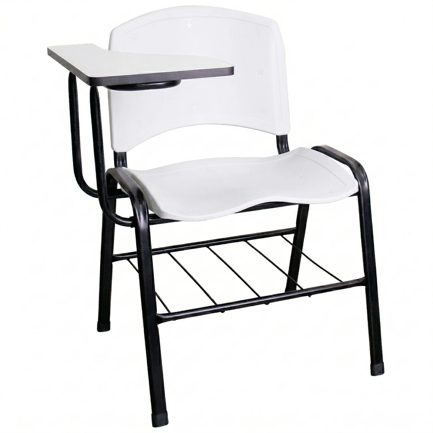 Material: Base montável no AÇO carbono ABNT1020 reforçado com tubos oblongos e redondos 30x16 mm, espessura 1,50 mm com pintura eletrostática, assento e encosto em polipropileno e prancheta em MDF.
