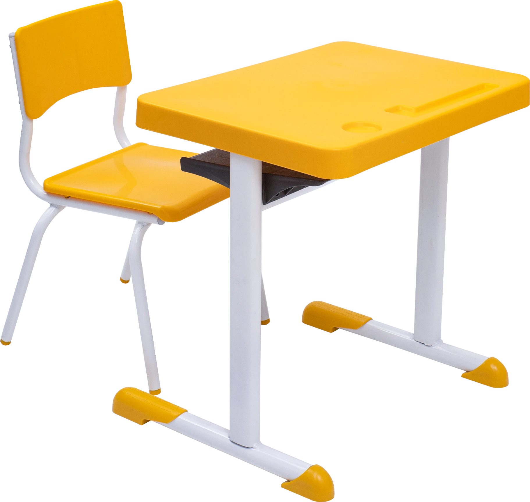 Cadeira e mesa projetadas para oferecer conforto, postura adequada e segurança no uso diário, com assento e encosto moldados ergonomicamente em polipropileno injetado, sem orifícios ou cantos vivos.