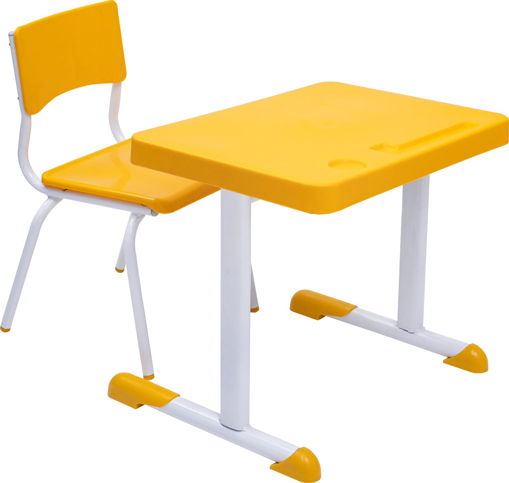 Cadeira e mesa projetadas para oferecer conforto, postura adequada e segurança no uso diário, com assento e encosto moldados ergonomicamente em polipropileno injetado, sem orifícios ou cantos vivos.