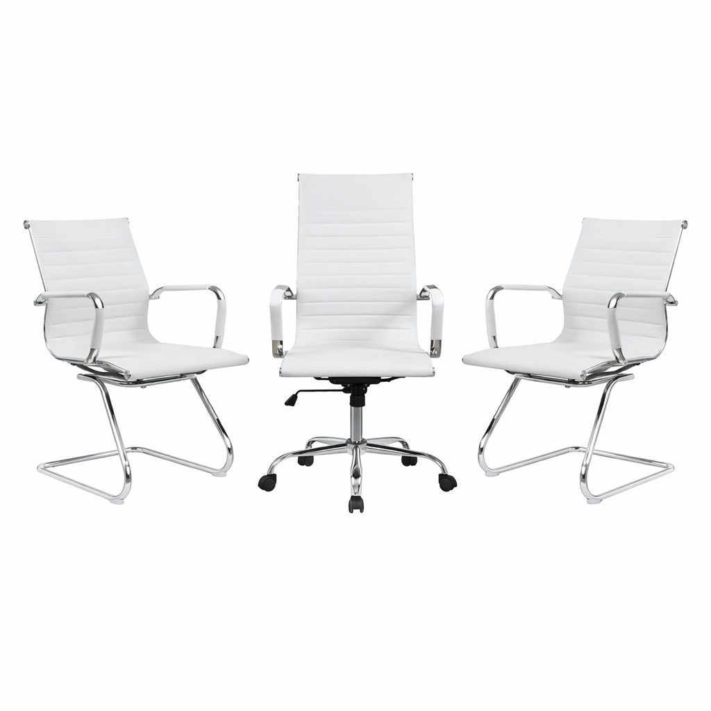 Modelo: 1 cadeira giratória presidente com ajuste de altura do assento, encosto de braços fixos, mecanismo RELAX com ajuste de tensão + 2 cadeiras fixas