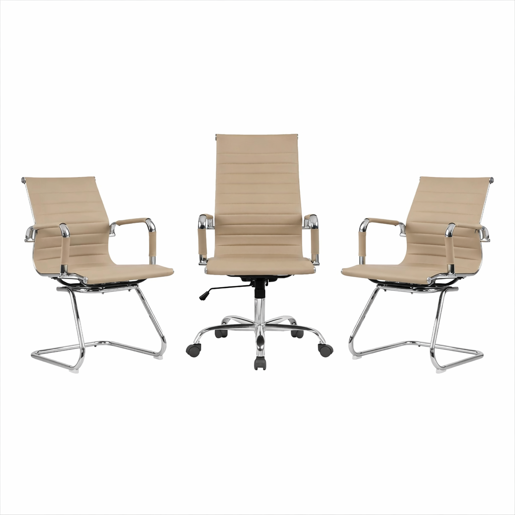 Modelo: 1 cadeira giratória presidente com ajuste de altura do assento, encosto de braços fixos, mecanismo RELAX com ajuste de tensão + 2 cadeiras fixas