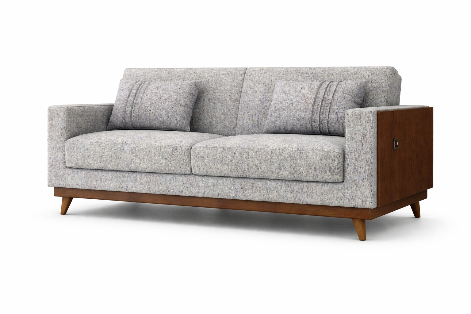 Produzido em madeira de eucalipto. Assento e braços D23, encosto D20. Percintas elásticadas + molas espirais. Suporta 110Kg por assento.